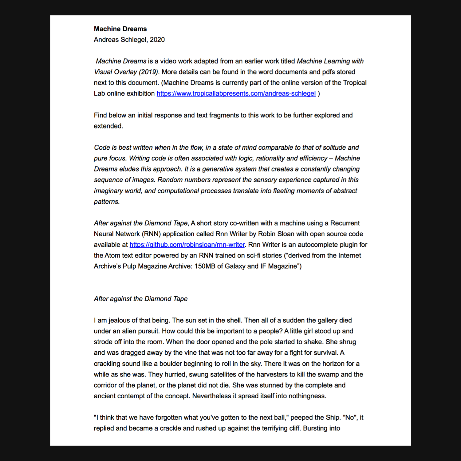 Machine Dreams is a video work adapted from an earlier work titled Machine Learning with Visual Overlay (2019).